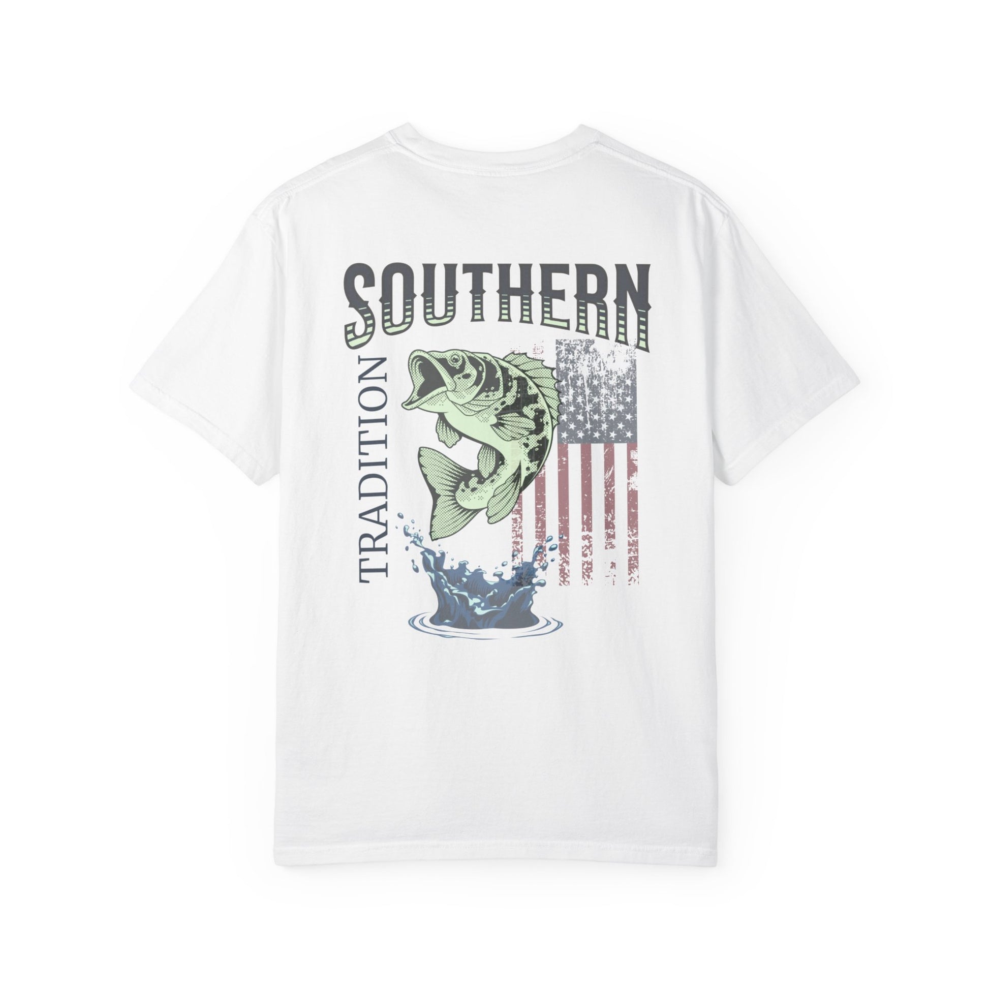 Show your Southern pride and love for fishing with this unique US flag and bass fish design on a comfortable unisex garment-dyed T-shirt. Perfect as a Fathers Day gift, this shirt exudes tradition and patriotism, making it a great addition to a fishing enthusiast's wardrobe. Ideal for celebrating Fathers Day and other patriotic holidays.